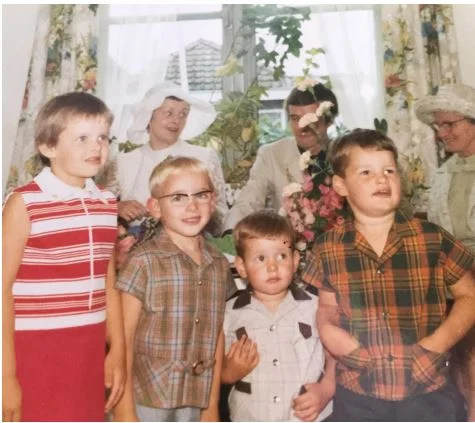 Janet is the oldest of a family of five children. Immediately after her is a sister with multiple handicaps who lives in an institution. Then follow three brothers. Of her parents, only her mother is still alive. In the photo, Janet can be seen with a couple of her brothers, a cousin, an uncle and an aunt. (Left: Janet, boy with glasses is nephew, the other two boys are Janet's brothers Geurt and Willem)
